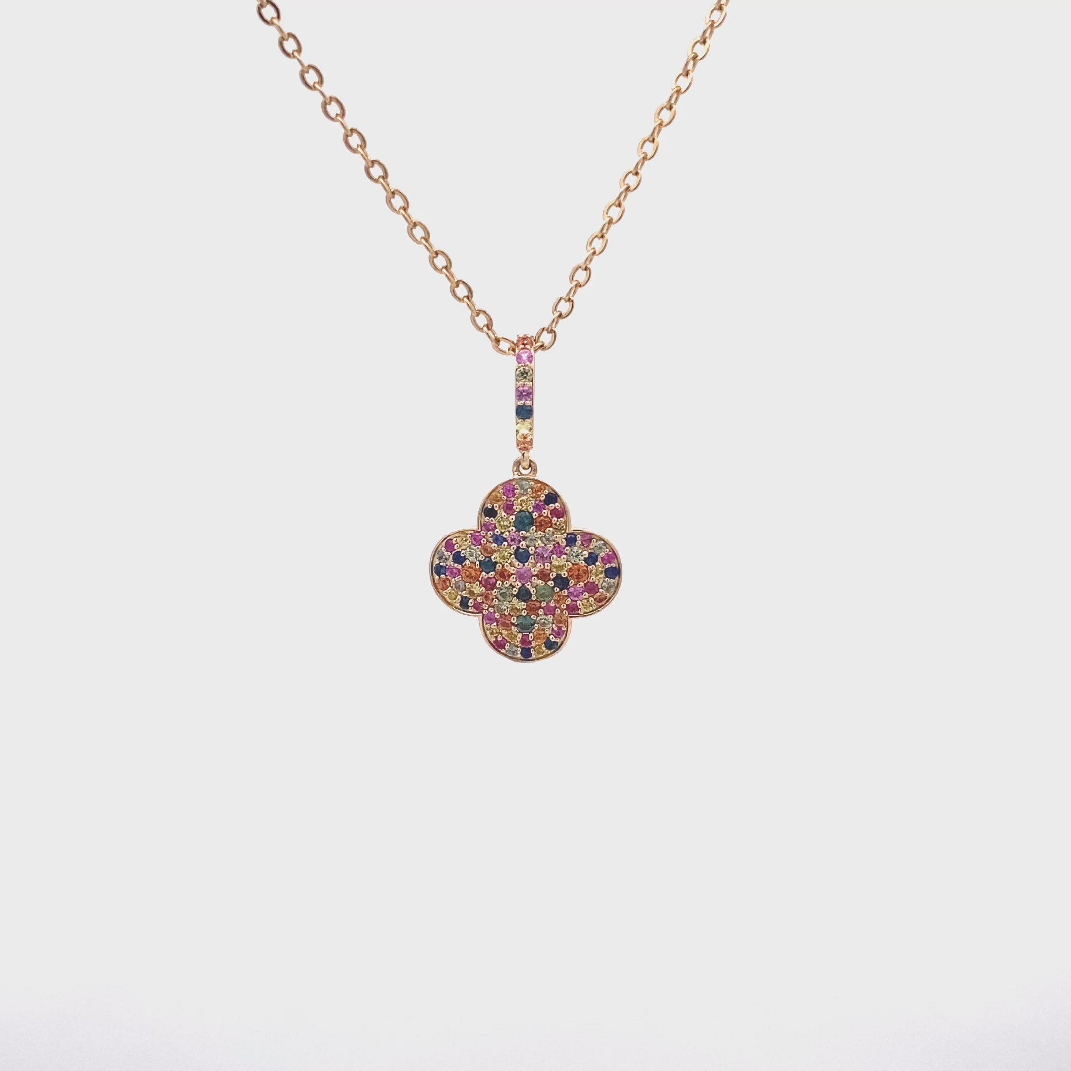 Vibrant and joyful, this 9ct yellow gold pendant necklace features a striking clover motif set with an array of natural multi-colour sapphires, totalling 0.70ct.